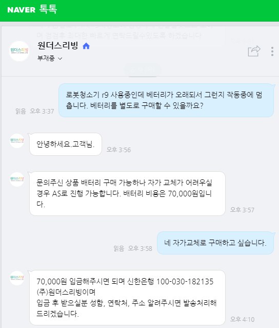 다른 로봇청소기도 배터리 문제여서 배터리를 교체하려고 원더스 리빙에게 문의를 했다.